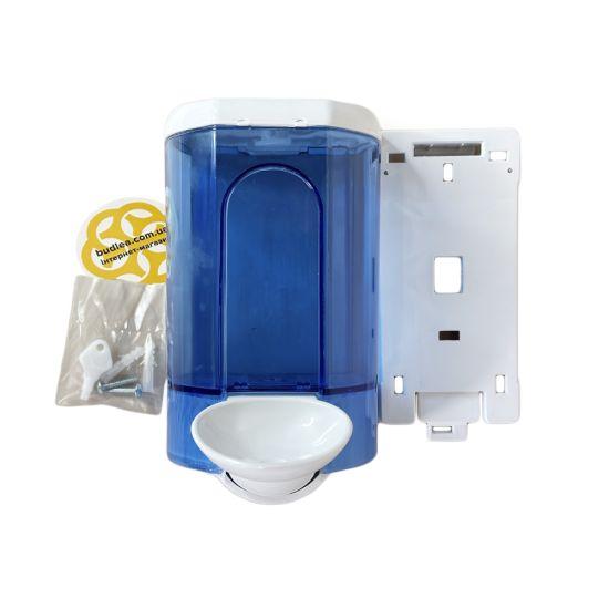 Пластиковий ліктьовий дозатор для мила 1100 мл, настінний, синій з білою кнопкою