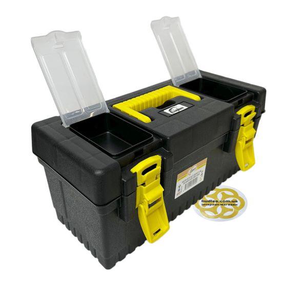 Надійні пластикові застібки. Для гарантії безпечного зберігання вашого інструменту ящик оснащений надійними пластиковими застібками. Ці застібки забезпечують міцне закріплення кришки, запобігаючи випадковому відкриття та випадання інструментів. Ви можете бути впевнені, що інструмент завжди буде в надійних руках навіть при транспортуванні ящика.
