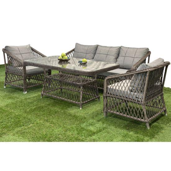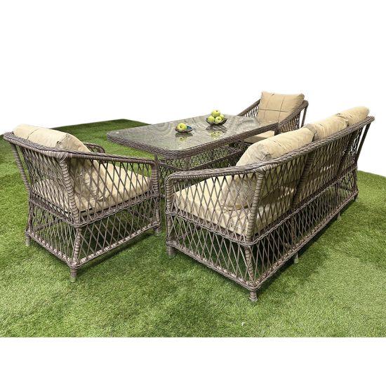 В комплект входить обідній стіл, два стільці та тримісний диван, доповнені кольоровими подушками для комфорту. Стіл має прямокутну форму та скляну поверхню, товщина скла - 5 мм. Каркас меблів виготовлений із алюмінієвої трубки.
